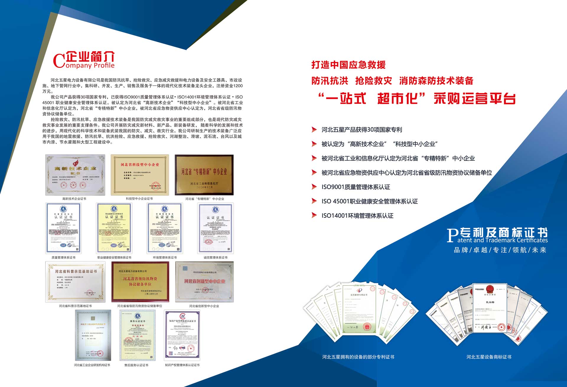 河北五星電力設備有限公司是我國防汛抗旱、搶險救災、應急減災救援和電力設備及安全工器具、市政設施、地下管網(wǎng)行業(yè)中,集科研、開發(fā)、生產(chǎn)、銷售及服務于一體的現(xiàn)代化技術(shù)裝備高新技術(shù)企業(yè),注冊資金1200萬元。  我公司產(chǎn)品已獲得ISO9001質(zhì)量管理體系...